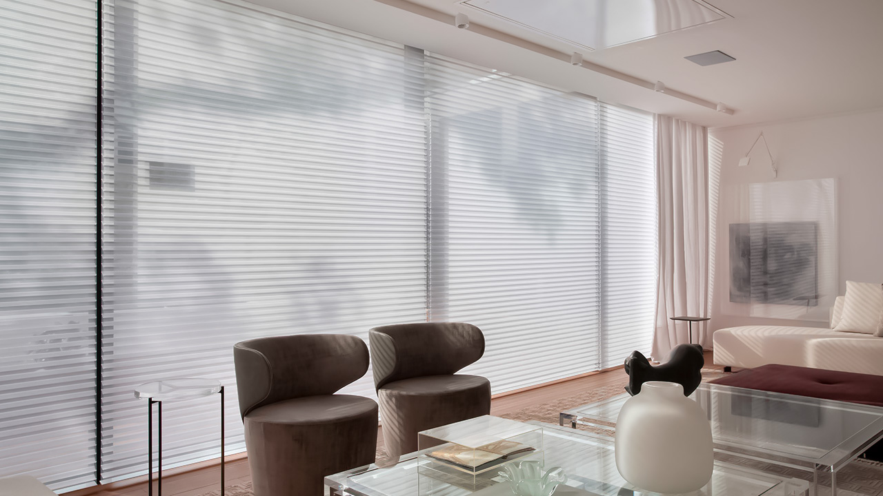 As persianas Shangrila combinam o melhor das cortinas de tecido e das persianas horizontais. Com suas lâminas de tecido suspensas entre duas telas translúcidas, permitem controlar a entrada de luz de forma suave e gradual, criando um efeito acolhedor.